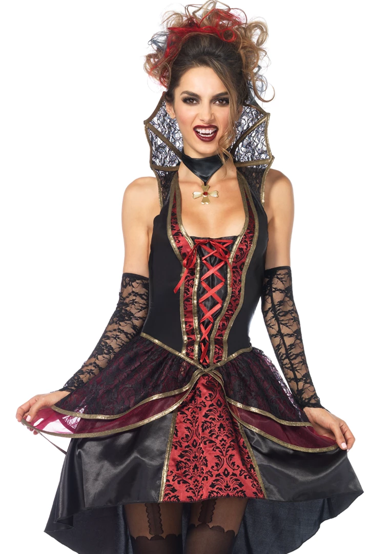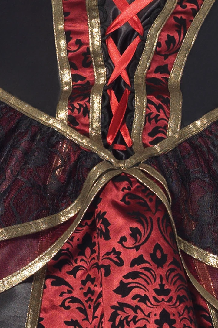 You may be old, but you’re still looking fine in this Age-Old Vampire Queen costume featuring a vampire costume. This three piece Gothic vampire costume features a high-low dress, faux lace up ribbon, pair of lace gloves with stretch elastic around the arm, satin choker. *Pantyhose not included.