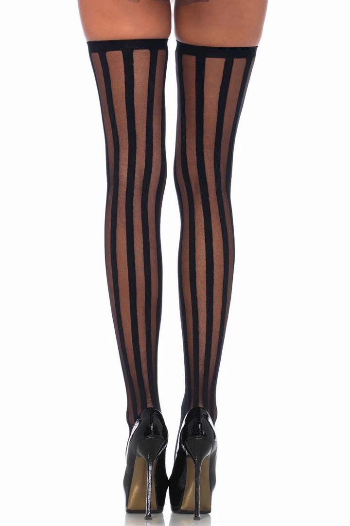 - Includes: Pair of Black Vertical Striped Thigh Highs