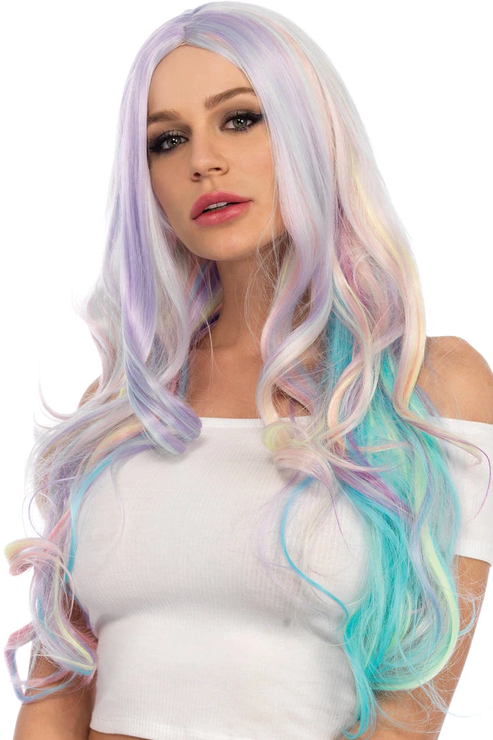 Pair your inner magic with this Pastel Rainbow Long Wavy Wig that features a colorful compilation of pastel strands cascading into long soft curls. Includes built-in wig cap.