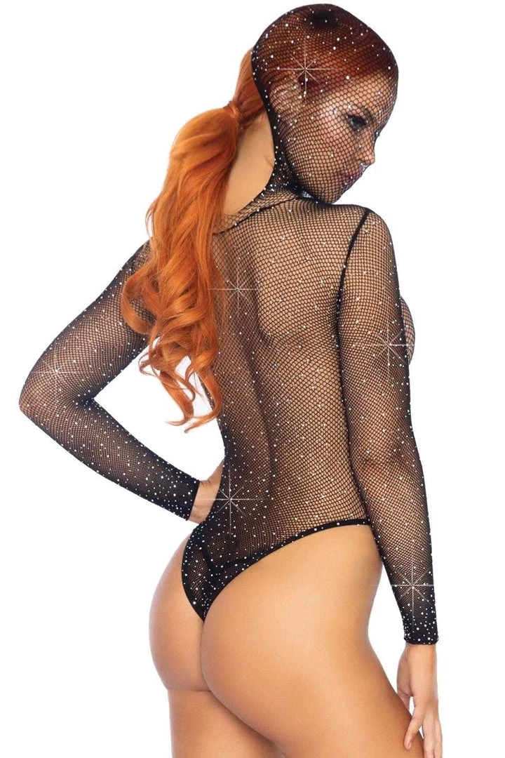 Let’s get kinky in this Rhinestone Fishnet Hooded Teddy! Live out your fantasy in the bedroom or create a glam fashion look with this fishnet bodysuit with attached front-facing hood with attached rhinestones.