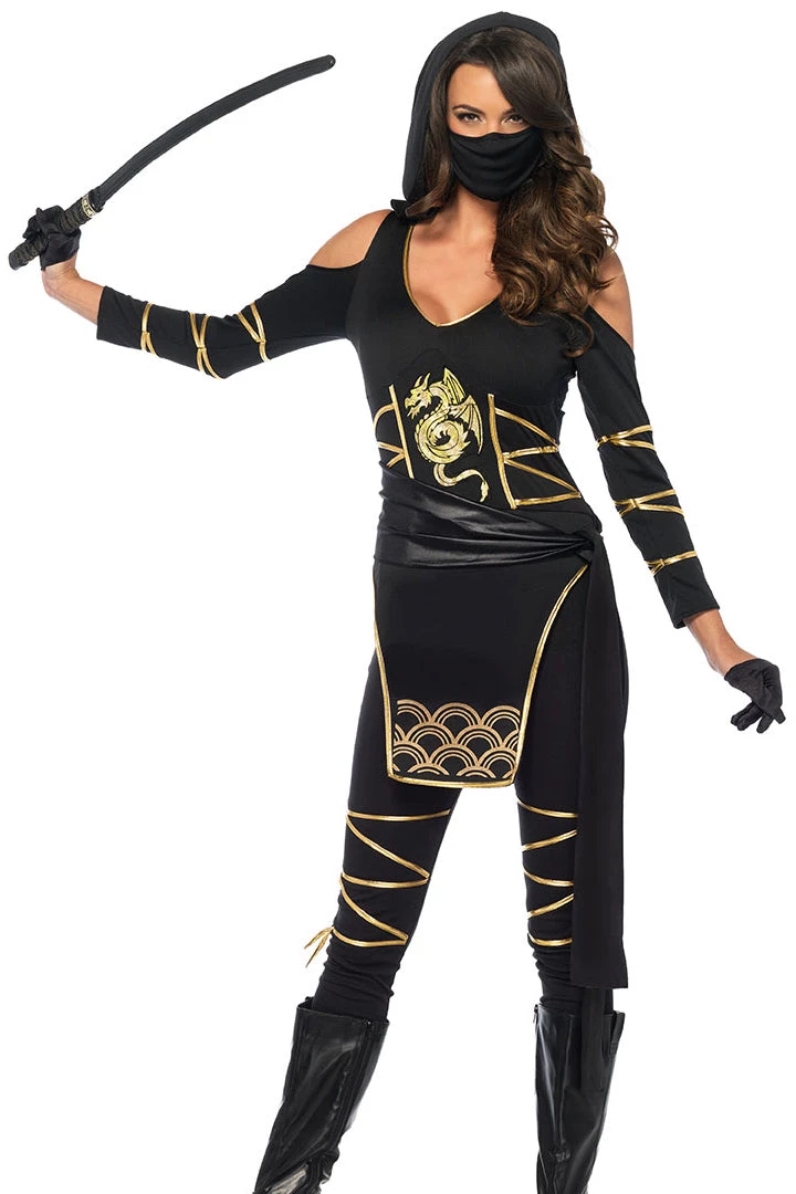 This Stealth Assassin Black & Gold Ninja Costume combines comfort with intrigue. Featuring a three piece outfit, this women’s ninja costume includes a black catsuit with shoulder cutouts, gold details, waist sash, and face mask. *Props not included.
