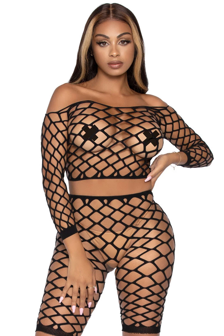 Featuring a strong stretchy net, long sleeve crop and matching high waist bike shorts. This curve hugging fit and cheeky netting are sure to show off your very best assets. While the matching crop top adds major sex appeal with the see-through net, long sleeves and off the shoulder design From casual summertime cover to fierce festival wear, this daring set is sure to make an impression any way you wear it.