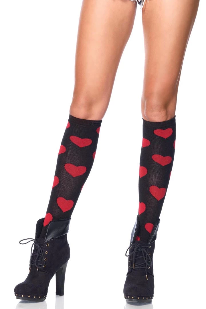 Express your love in fashion featuring these Love Sick Knee High Opaque Stockings women’s knee high socks. These knee high stockings feature black opaque stretch stockings with large red hearts pattern.