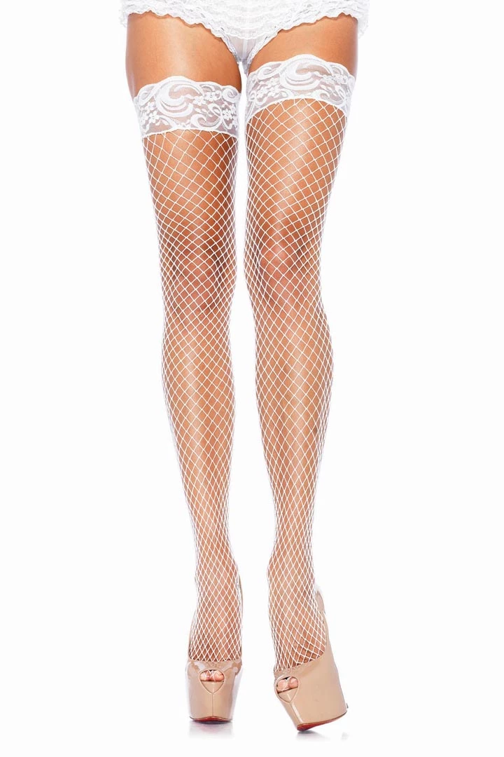 Dance the night away without a wardrobe malfunction featuring these White Stay Up Lyrca Fishnet Stockings that feature lurex lace tops with soft stretch fishnet pattern and footed stockings.