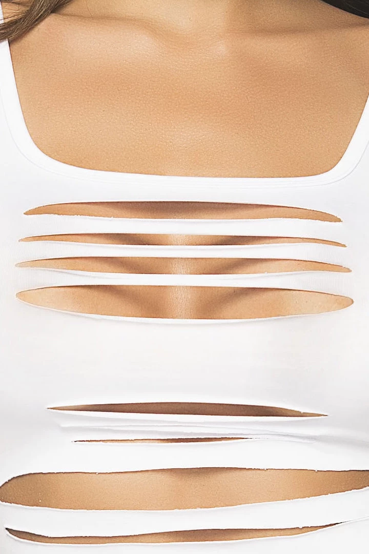 A combination of edgy and sexy, this White Slashed Crop Top features a look perfect for the club or on stage. This sexy crop top includes slashes across the front and a solid back.