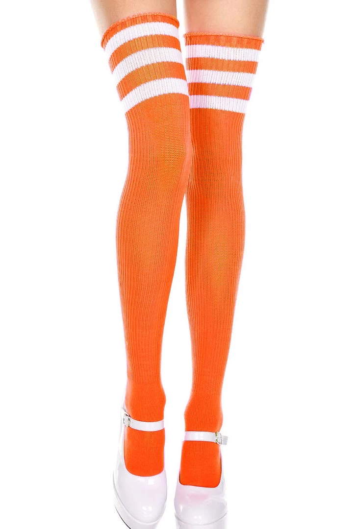 Accentuate those legs with these Neon Orange and White Striped Thigh High Socks that feature bright neon orange women’s thigh high socks with white stripes around the thighs.