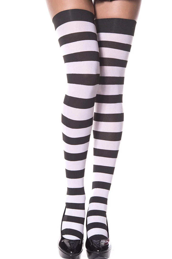 Take your costume to the next level with these black and white horizontal striped thigh high leggings.