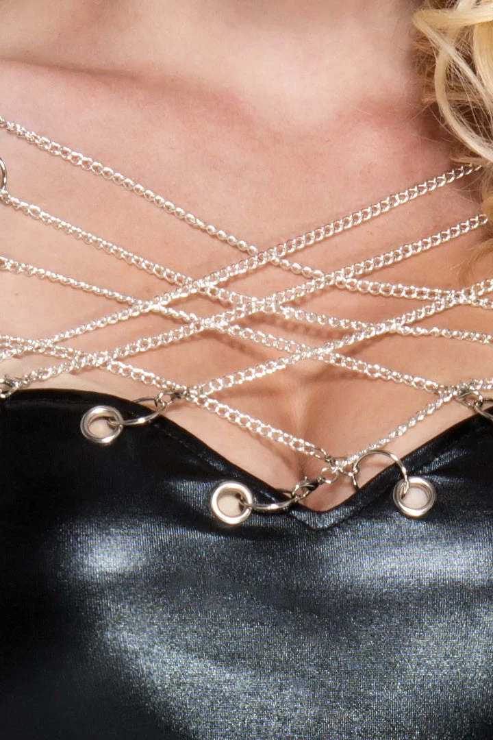 Saucy on the streets and a freak in the sheets! Show your she-devil self in this Long Sleeve Black Wet Look Dress W/ Chain Detail that features a long sleeve mini dress with cutout accents, sweetheart neckline, and seductive neckline with criss cross chains. Give that dominatrix outfit a punch of class with this stretch polyester material that features a glossy sheen creating a ‘wet look’ affect.