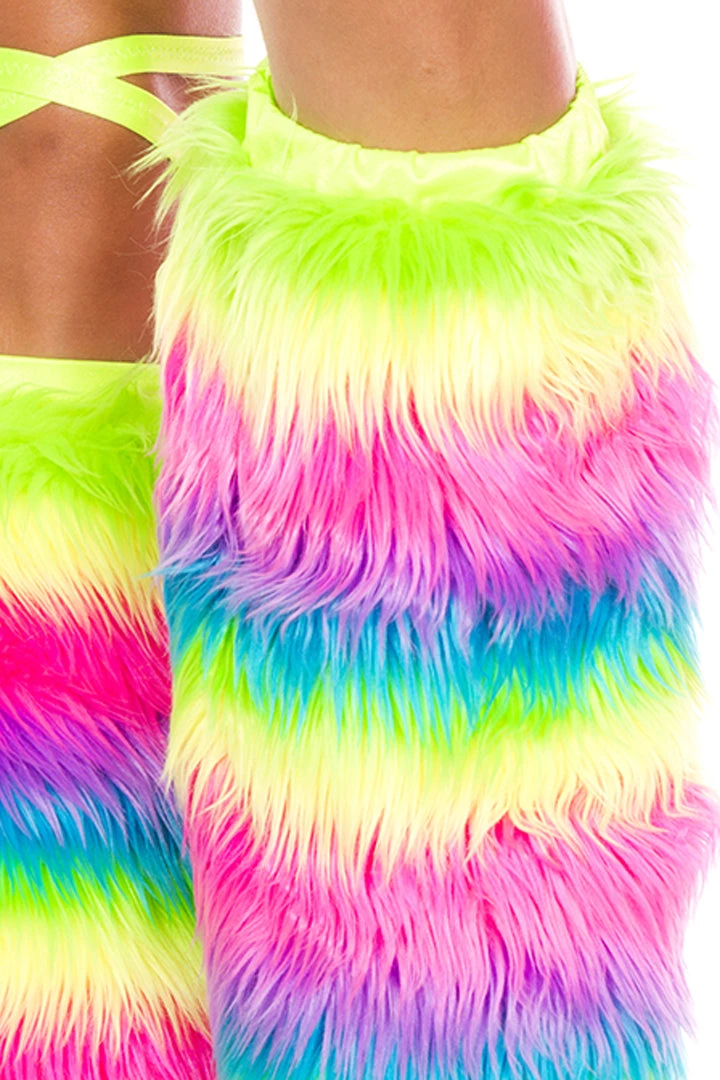 Complete your rave wear outfit when you wear these Neon Rainbow Furry Leg Warmers accessories. These faux fur Rave Leg Warmers feature neon rainbow horizontal stripes and soft stretch elastic band. Includes a set of 2 leg warmers.