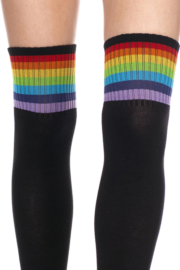 Taste the rainbow when you wear these Black Thigh High Sock Stockings with Rainbow Stripes on Top. Features black thigh high socks with bright horizontal rainbow stripes.