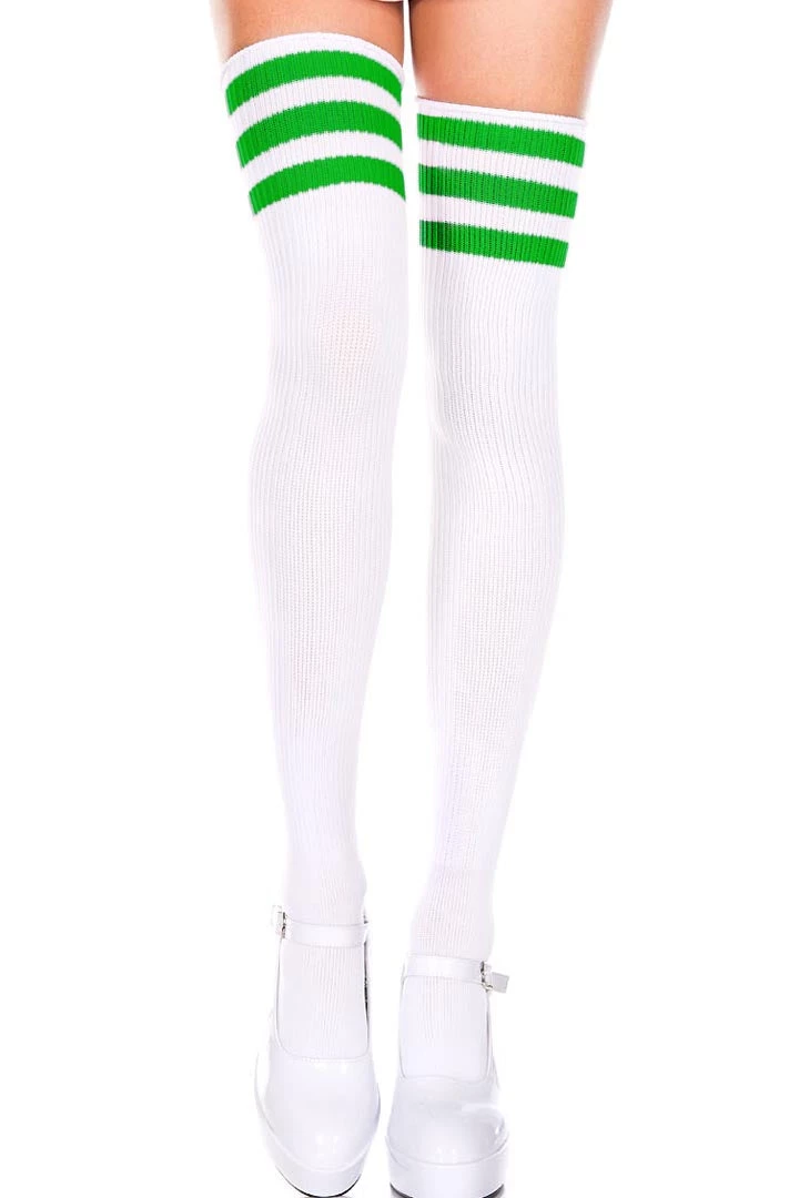 Accentuate those legs with these White & Kelly Green Striped Thigh High Socks that feature white women’s thigh high socks with green stripes around the thighs.
