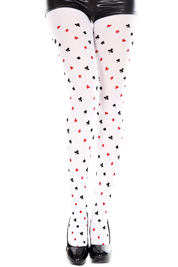 Put on your best poker face in these The 4 Suits Design Pantyhose featuring white opaque pantyhose stockings with playing cards suits design pattern.