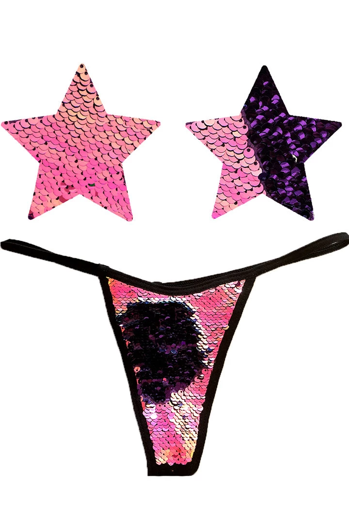 Friendship comes in every color with these My Lil Pony Flip Sequin Nipple Pasties & G-String Panty that features an explosion of awesomeness in one package! This three piece package includes a pair of lavender/green and purple flip sequin star nipple pasties that form seamlessly to curves. Wave your hand over the sequins and watch them flip from lavender/green to purple! Includes a matching G-string thong panty with flip sequins over mesh and a stretch nylon waistband. Available in 8 different colors!