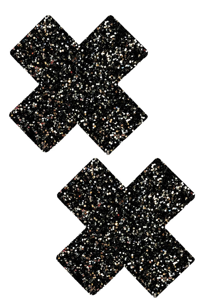 Black double x nipple pasties with big silver chunk glitter that feature latex-free medical grade adhesive and completely waterproof! Just peel and stick on clean dry skin. Lasts up to 10-12 hours.
