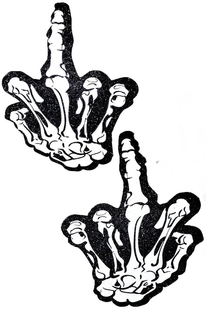 ‘Nuff said with these White Skeleton ‘FU’ Glitter Nipple Pasties that feature latex-free medical grade adhesive and completely waterproof! Just peel and stick on clean dry skin. Lasts up to 10-12 hours. Black-light reactive!