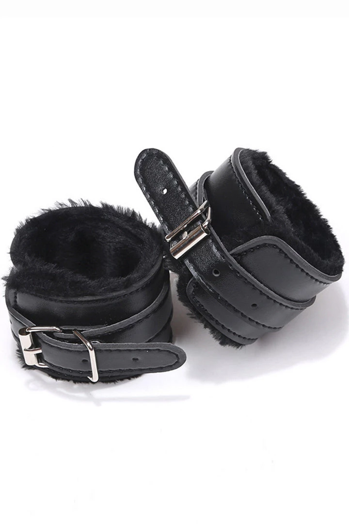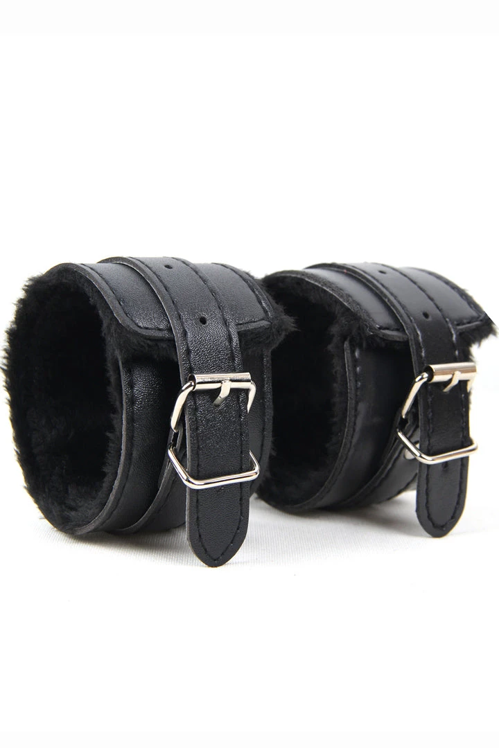 Your bondage lingerie wouldn’t be complete without these Black Faux Leather Furry Wrist Cuffs that feature a pair of toy adult wrist cuffs that are soft on skin, yet unyielding to the rough pleasures of bondage. These black wrist cuffs feature soft faux fur lining, adjustable buckle closures, and metal clasps to connect the wrist cuffs. Transform your erotic lingerie into an act of role play with these faux (imitation) leather wrist cuffs.