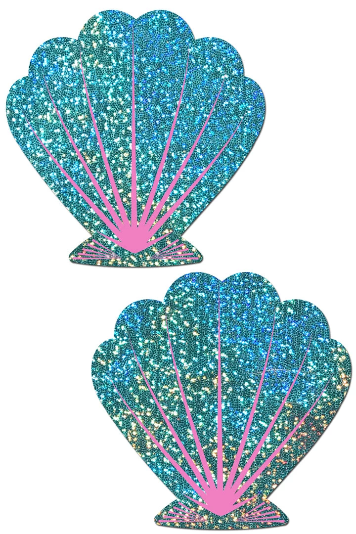Swim the waves with these Seafoam Glitter Seashell Nipple Pasties that feature a durable no-mess glitter pleather material that forms to curves and resists wrinkling over hardening nipples.