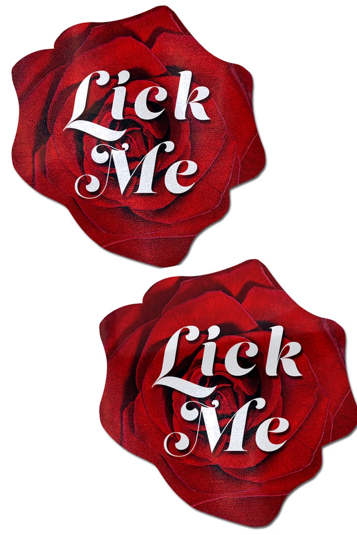 Say no more with these Blooming “Lick Me” Rose Nipple Pasties! Features a pair of rose shaped nipple pasties with the words LICK ME to wear with a sexy outfit, daring bikini, sheer top or revealing dress. Includes medical-grade adhesive, just peel-and-stick on clean, dry, oil-free skin.
