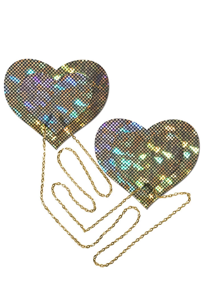 These Gold Shattered Heart Nipple Pasties with Chains feature iridescent gold pleather material that forms to curves and resists wrinkling over hardening nipples. Includes attached gold chains, just peel-and-stick on clean dry skin! Can be reused multiple times, and if the backing begins to wear off just use makeup glue to use them again!