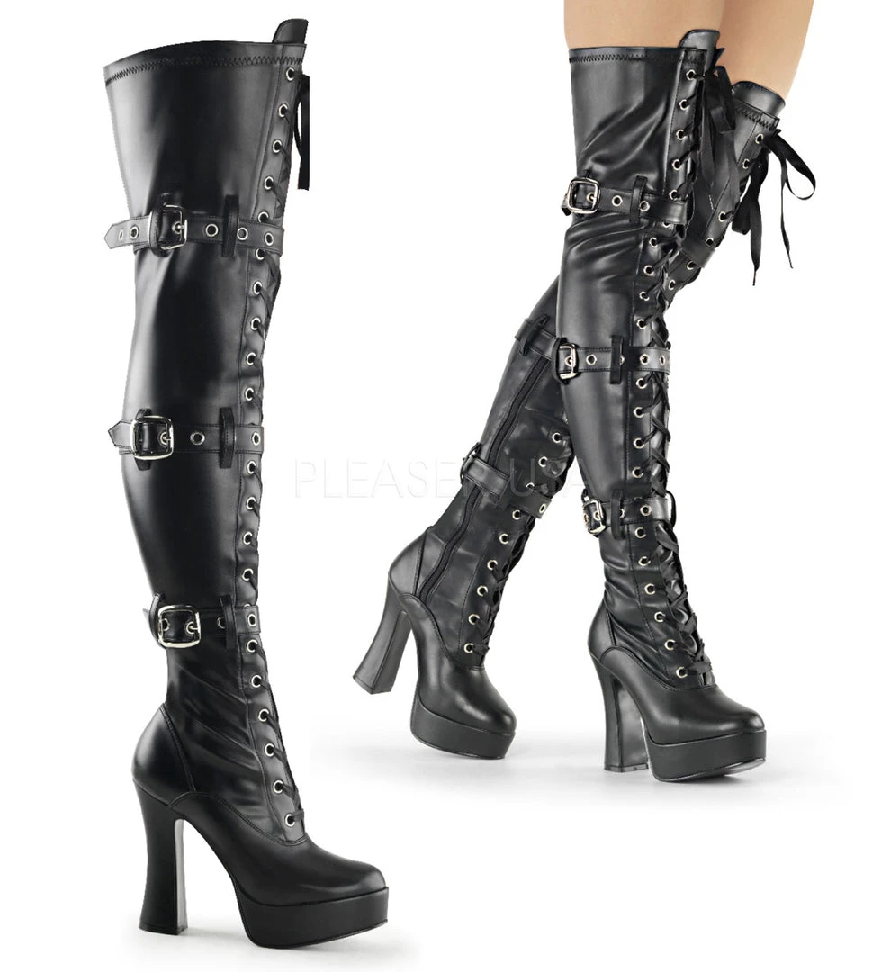 Women’s black 5 inch heel vegan leather thigh high boots with 1.5″ platform.