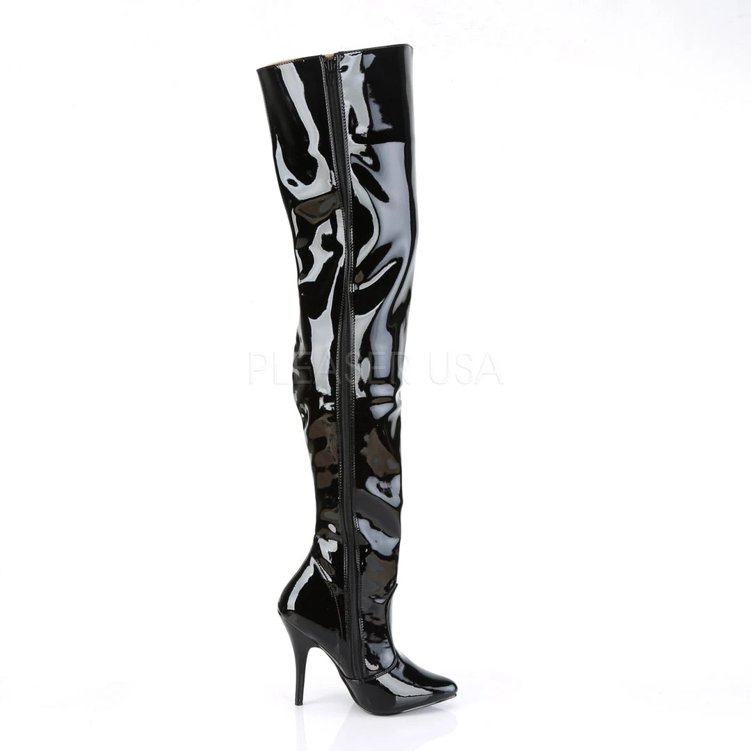 Women’s black thigh high boots with a 5 inch heel and flat platform.
