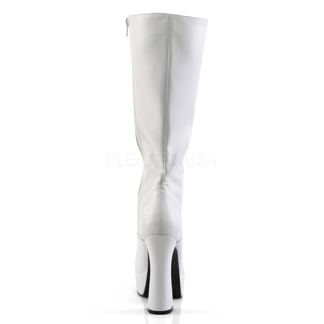 Combine comfort and sensual appeal 5″ heel white faux leather lace up knee high boots with a 1.5″ platform.