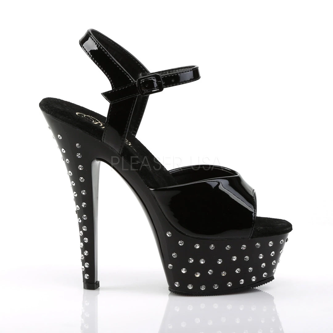 Make him go wild with these black 6 inch heel ankle strap rhinestone studded stripper shoes with a 1.8″ Platform.
