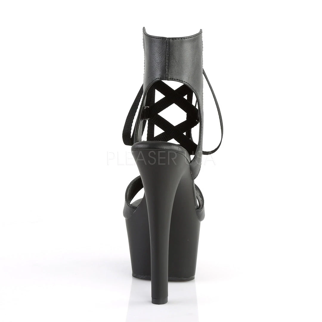 Accessorize your outfit with these 6 inch stiletto faux leather black sandal shoes with lace-up design and a 2.3″ platform.