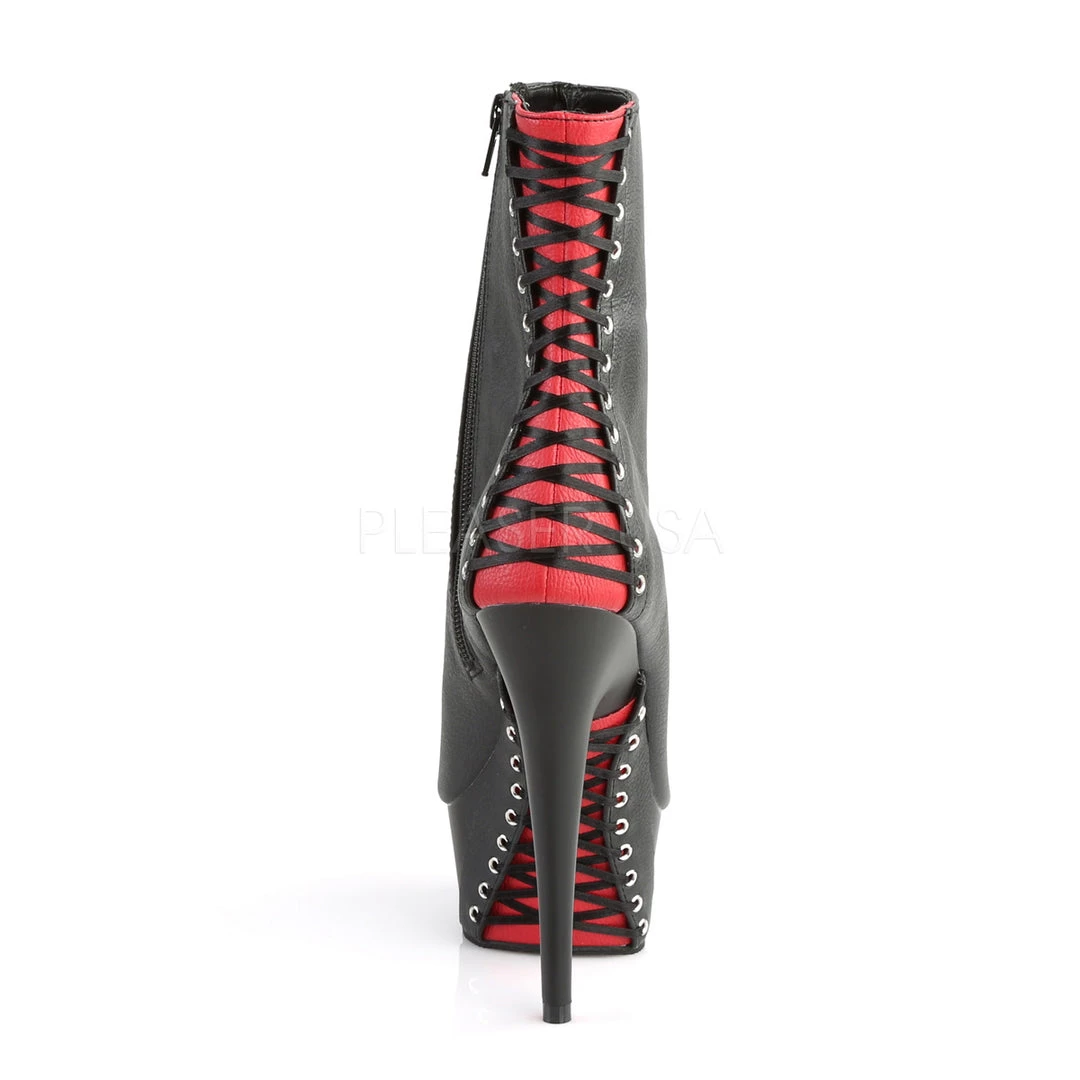 Make your legs and booty pop with these 6 inch black and Red peep toe faux leather ankle booties with a 1.8 inch platform.
