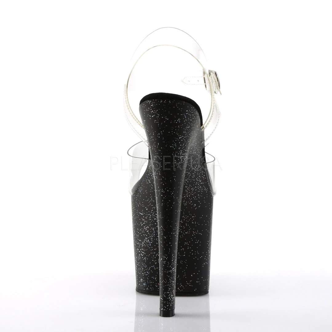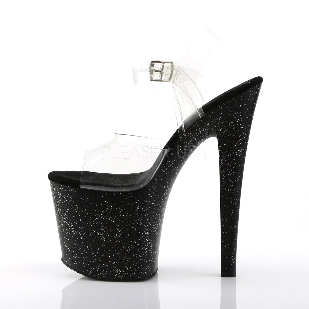 Women’s clear and black glitter 7.5 inch heel ankle strap pole dancing pumps with a 3.5″ Platform.