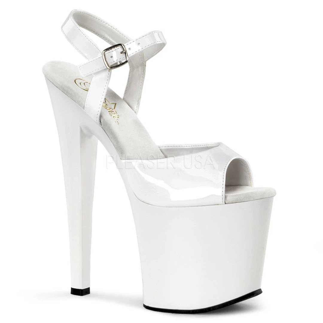 Women’s white 7.5 inch heel ankle strap stripper pumps with a 3.5″ Platform.