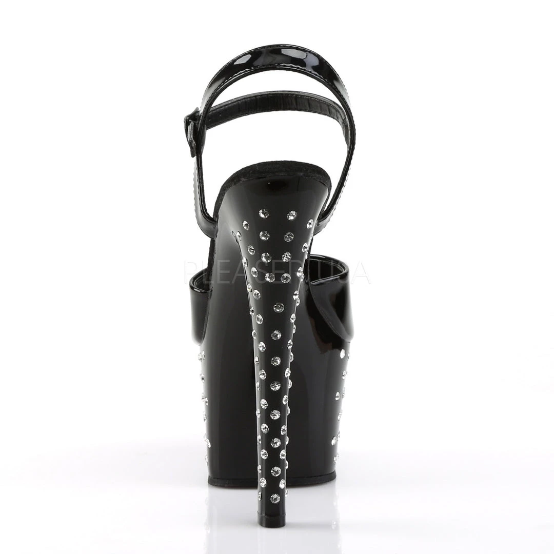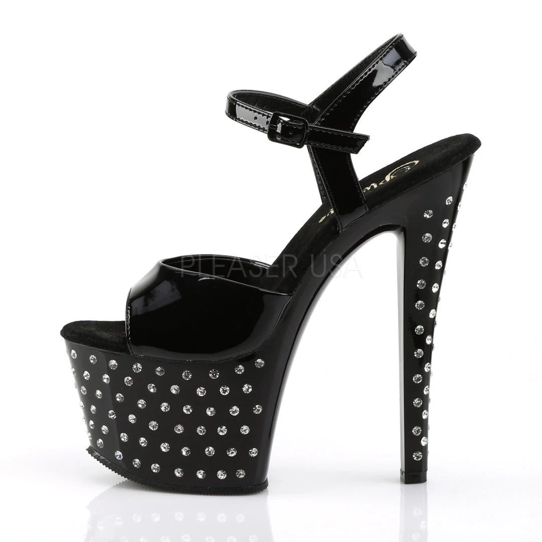 Turn up the heat with these black 7 inch heel ankle strap rhinestone studded pole dancing shoes with a 2.8″ Platform.