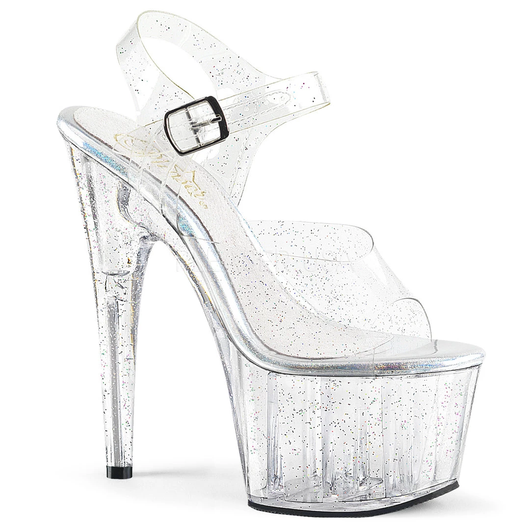 Women’s clear ankle strap glitter exotic dancer shoes featuring a 7″ heel and 2.8″ Platform, to help promote the appearance of longer firm legs and a perky booty.