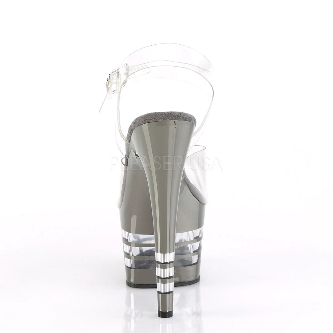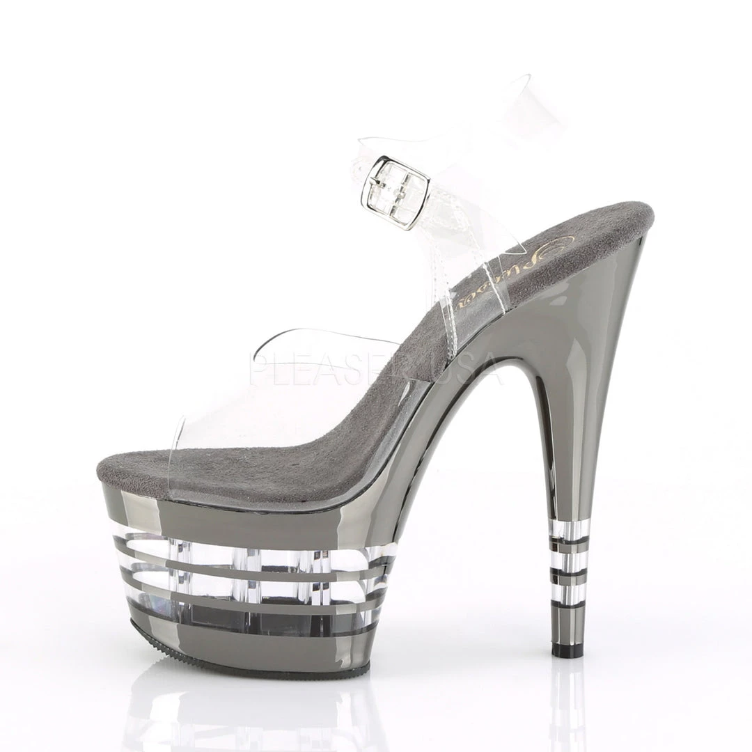 Give your legs that extra long look with these clear and silver 7 inch heel ankle strap pole dancing shoes with a 2.8″ Platform.