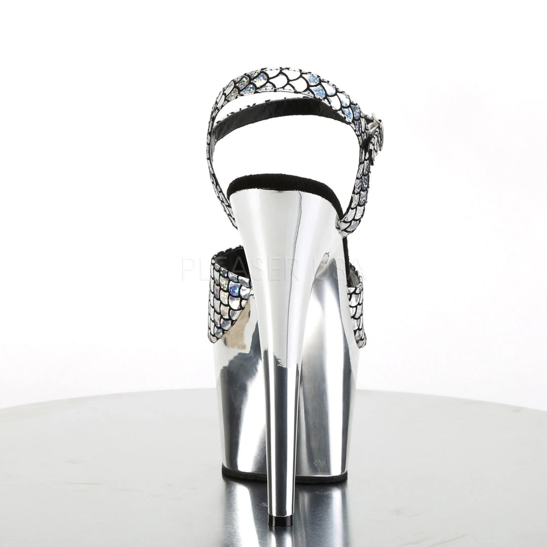 Women’s silver ankle strap stripper pumps with silver holographic mermaid scales, a 7″ heel and 2.8″ Platform, to give your legs that extra long look.
