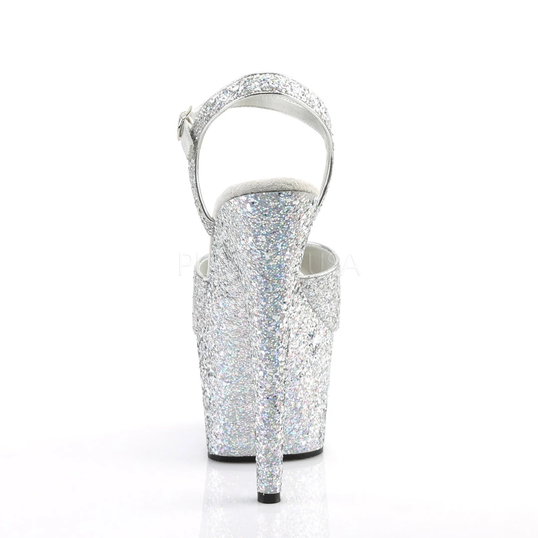 Women’s silver ankle strap glitter stripper shoes with a 7″ heel and 2.8″ Platform.