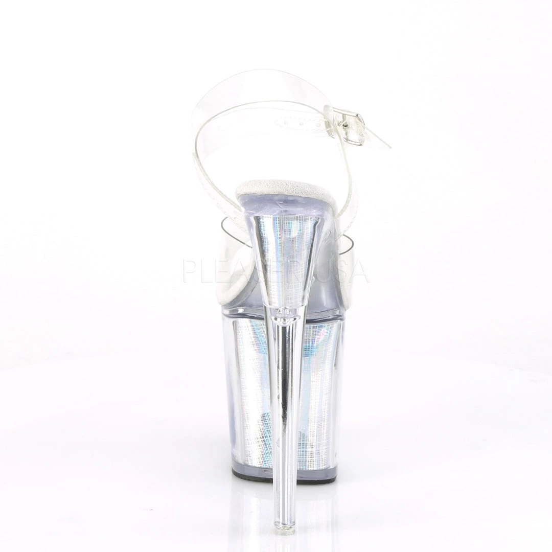 Whether you’re at the club, on a stage, or in the bedroom, you’re sure to get attention wearing these clear and silver 8 inch heel ankle strap LED illuminated stripper shoes with a 4″ Platform.