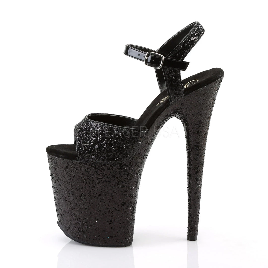 Women’s Black glitter 8 inch heel ankle strap exotic dancer pumps with 4″ Platform.