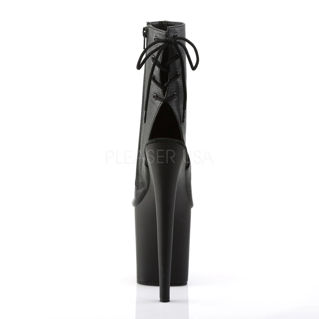 Women’s 8 inch black open toe/heel faux leather ankle booties with a 4 inch platform.
