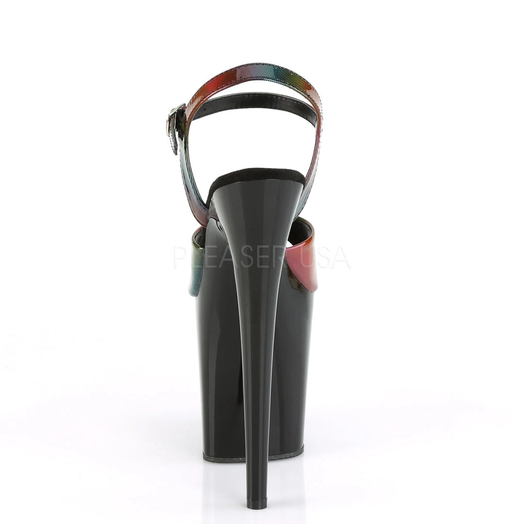 Make those legs and booty pop with these black and rainbow 8 inch heel ankle strap pole dancing shoes with a 4″ Platform.