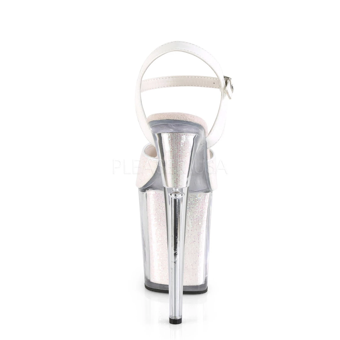 Women’s clear and white glitter 8 inch heel ankle strap stripper shoes with a 4″ Platform.