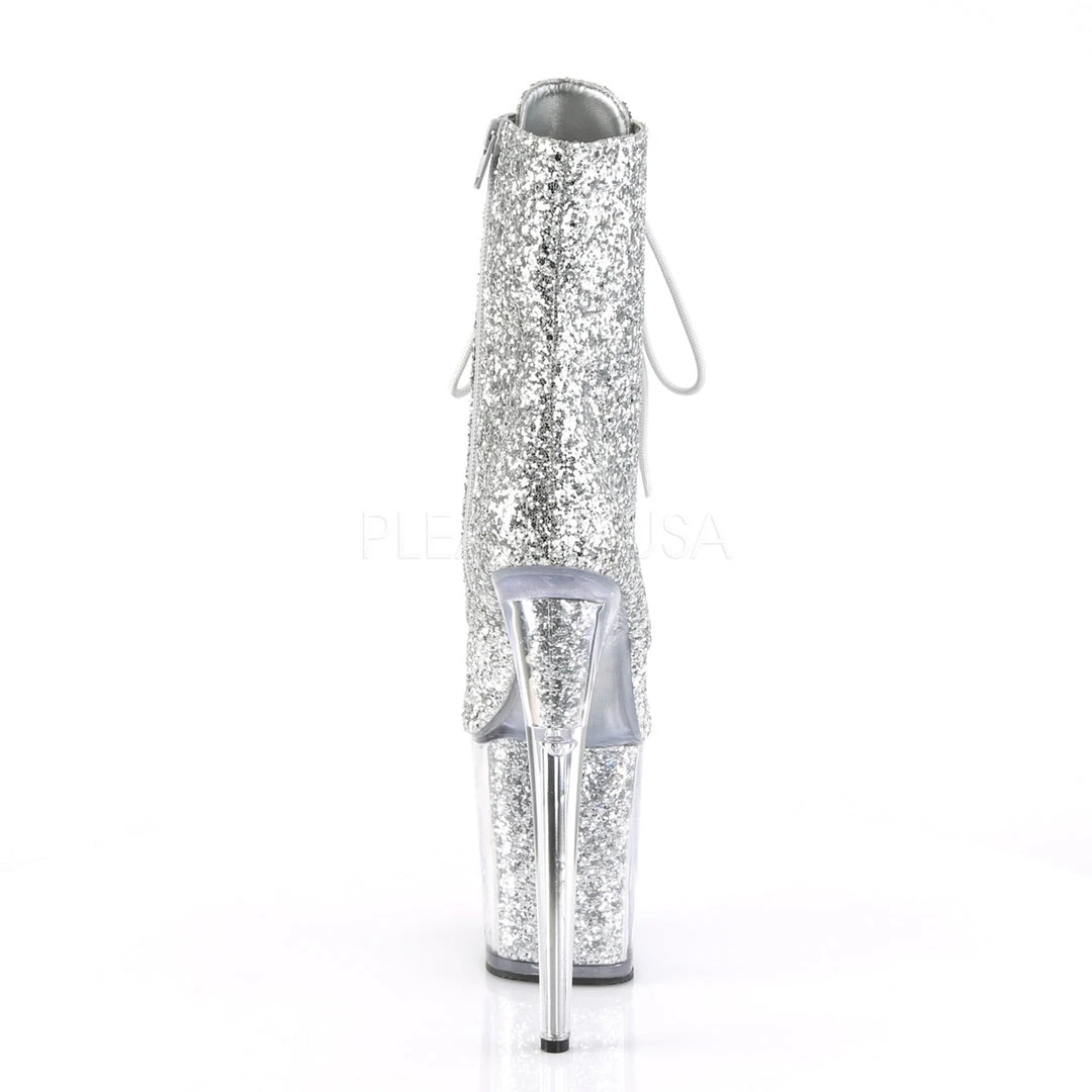 Women’s 8 inch silver glitter ankle booties with a 4 inch platform.
