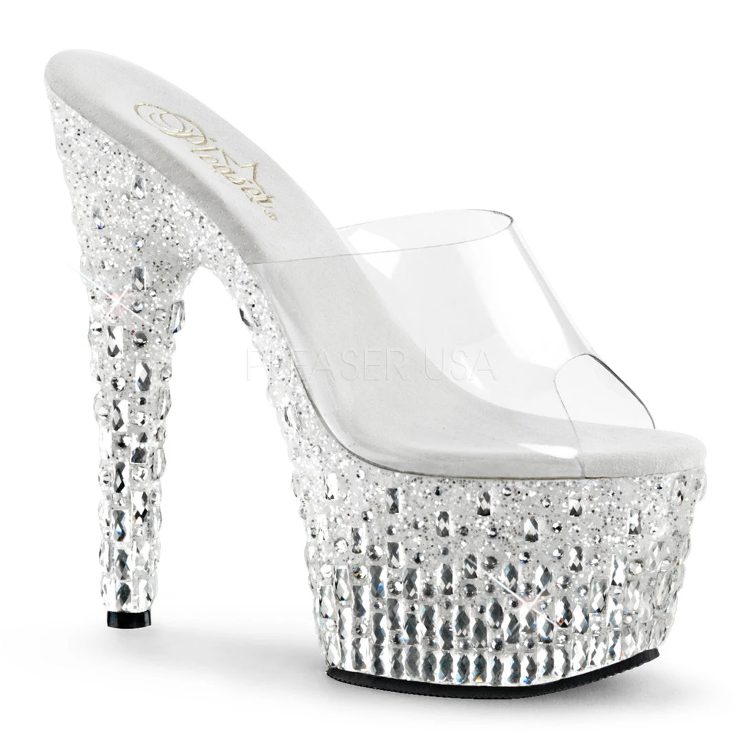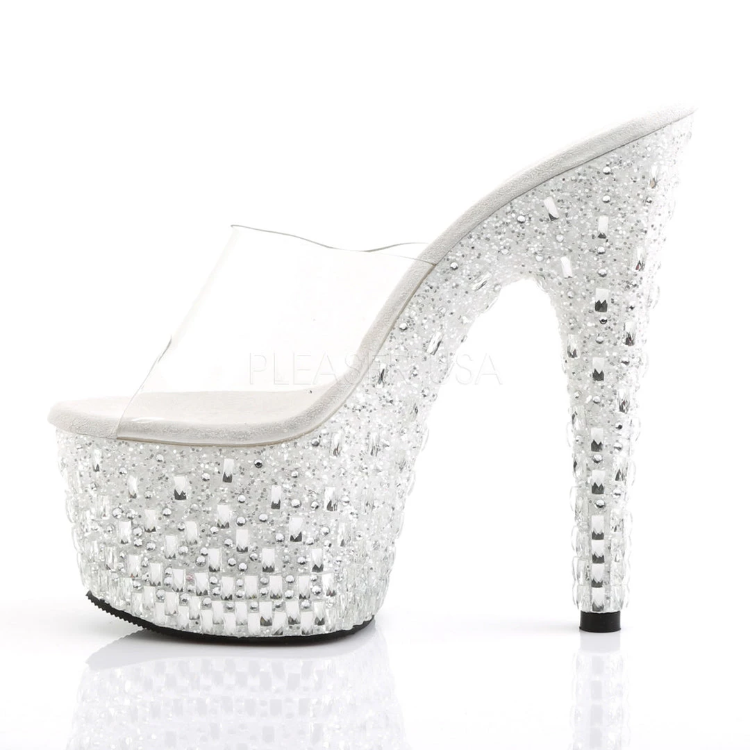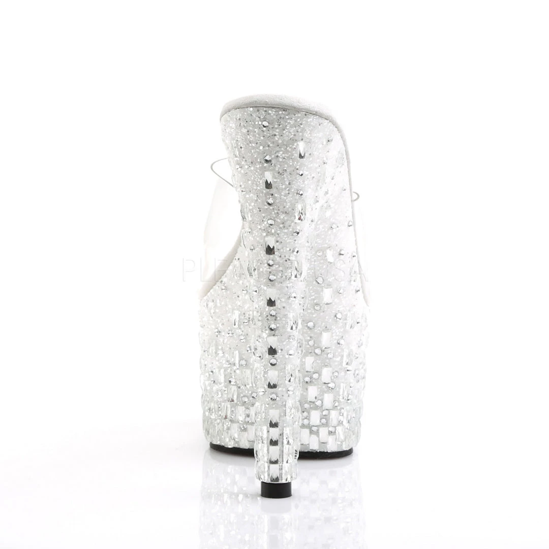 Women’s clear and white Platform slide glitter stripper shoes with a 7″ heel and 2.8″ Platform.