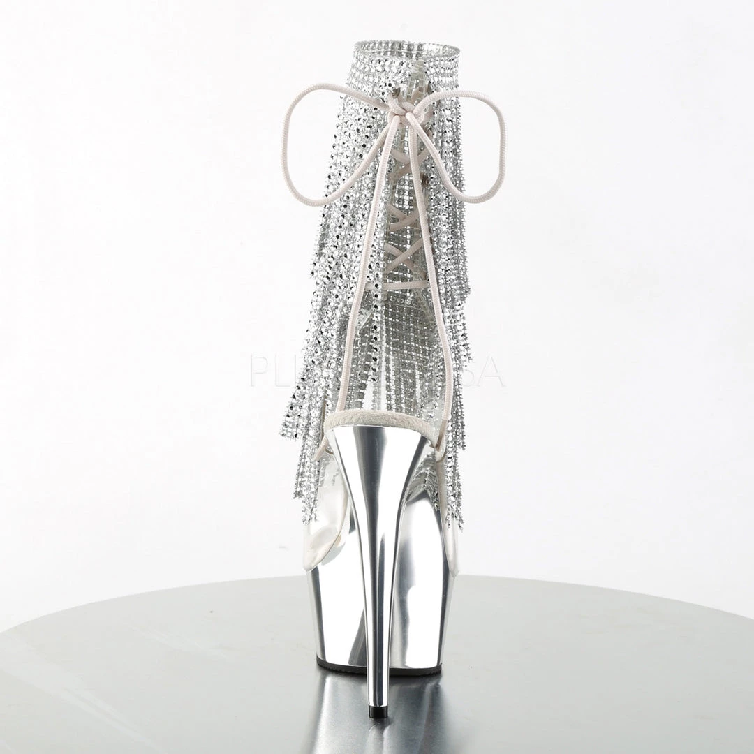 Pair of women’s 6 inch clear and silver open toe/heel lace-up ankle booties with a 1.8 inch platform.