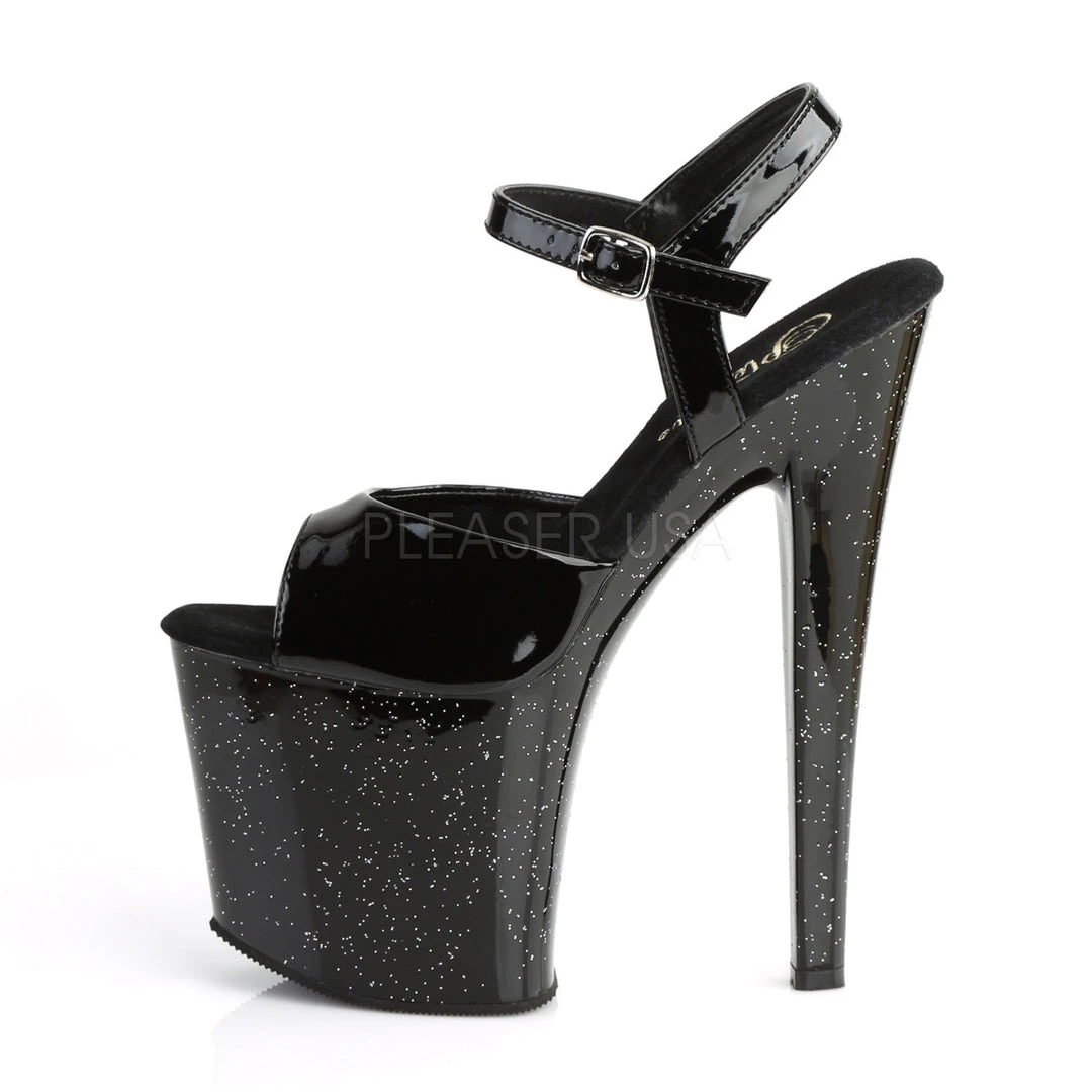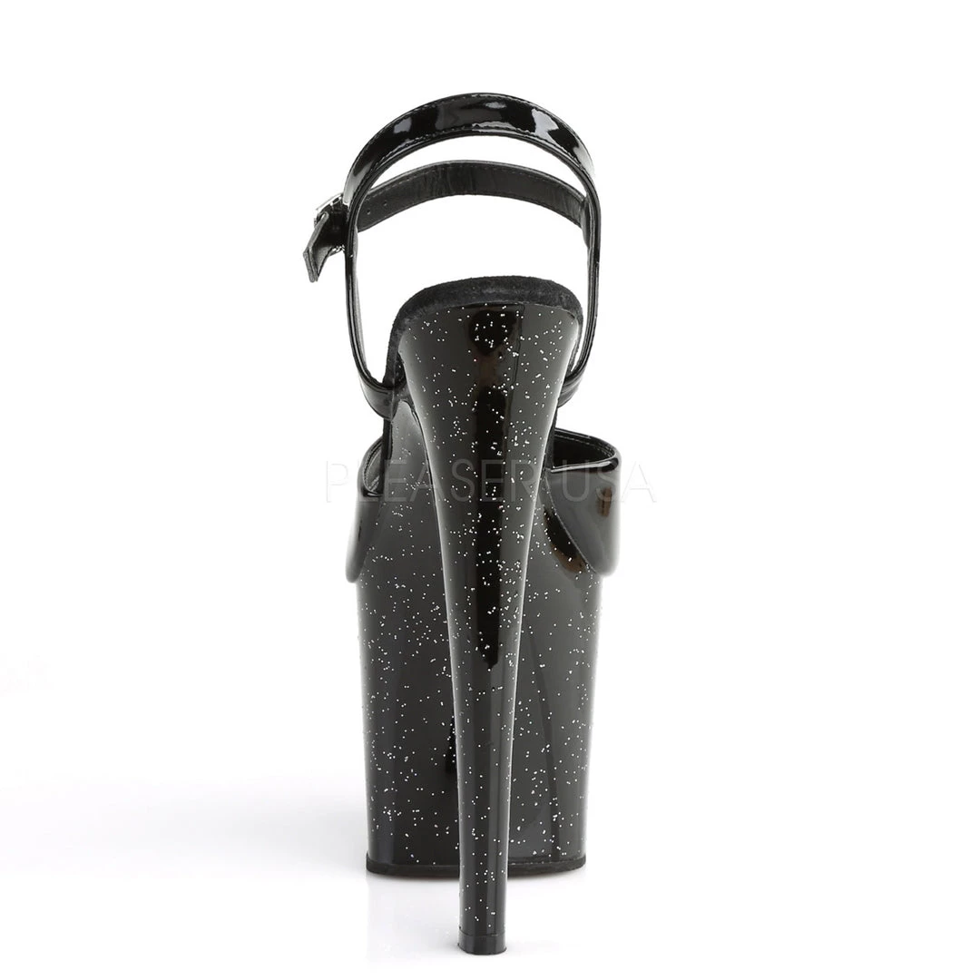 Perfect your outfit with these black glitter 7.5 inch stiletto heel ankle strap pole dancing shoes with a 3.5″ Platform.