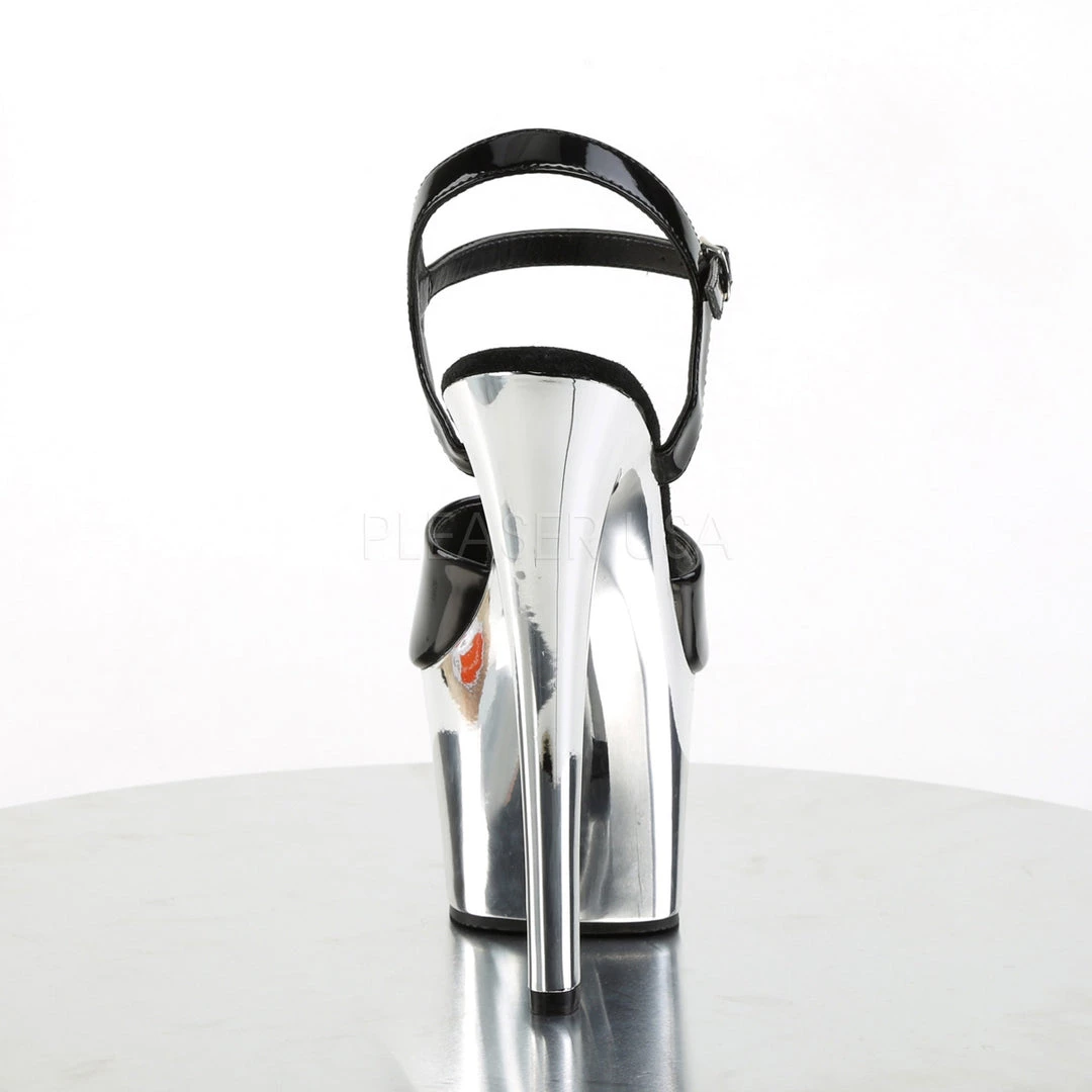 - 7″ Heel, 2 3/4″ Chrome Plated Platform Ankle Strap Sandal