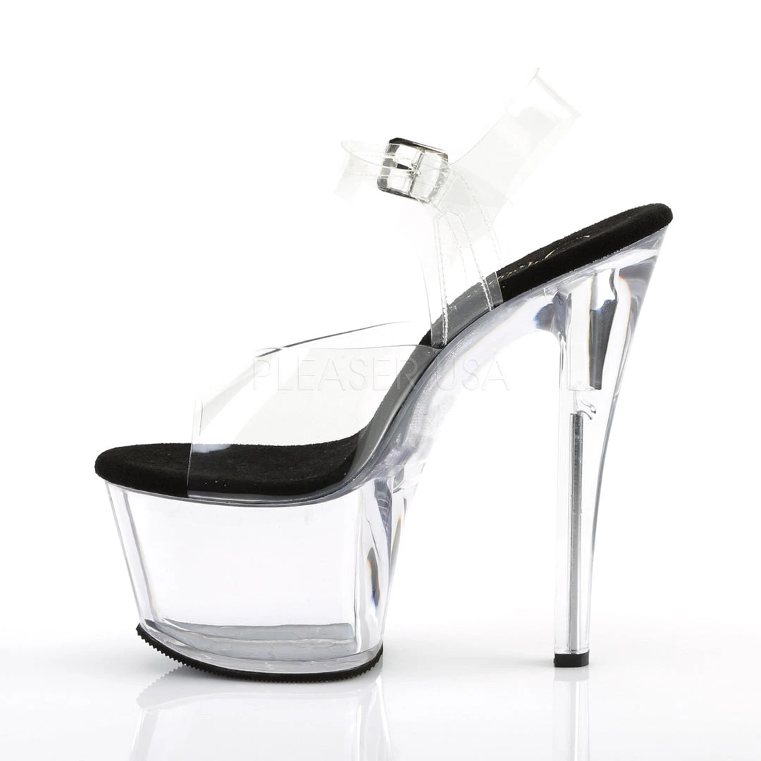 Women’s Clear/Black 7 inch heel ankle strap pole dancing shoes featuring 2.8″ Platform.