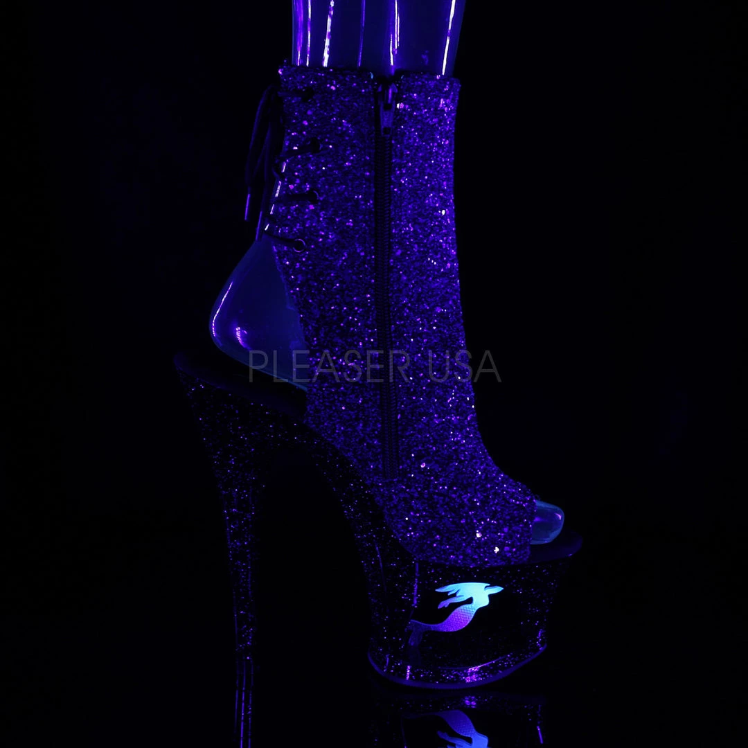 Accessorize your outfit with these 7 inch black and purple glitter open toe/heel ankle booties with a 2.75 inch platform.