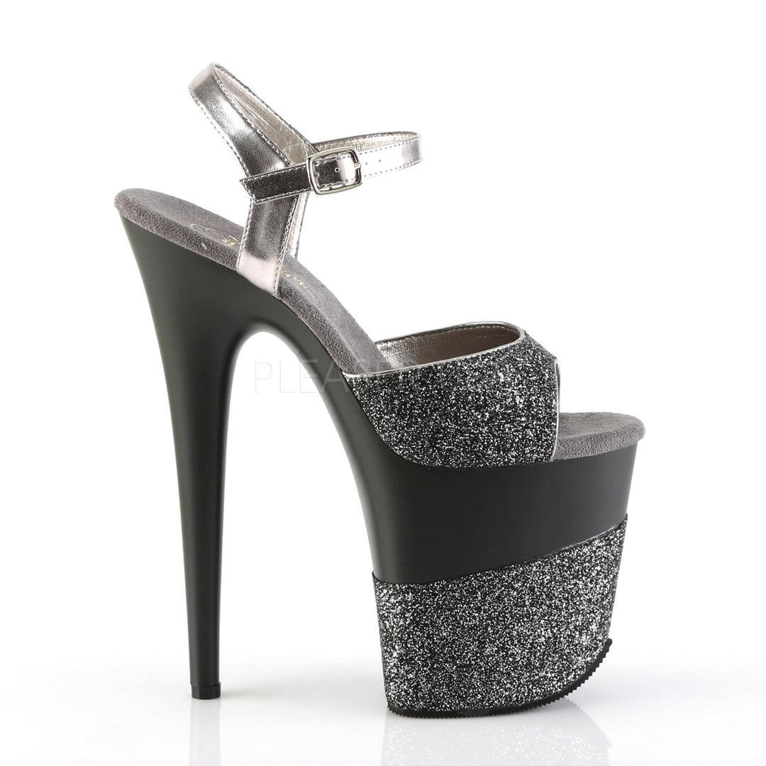 Women’s Black/Silver glitter 8 inch heel ankle strap exotic dancer pumps featuring 4″ Platform, to help promote the appearance of longer firm legs and a perky booty.