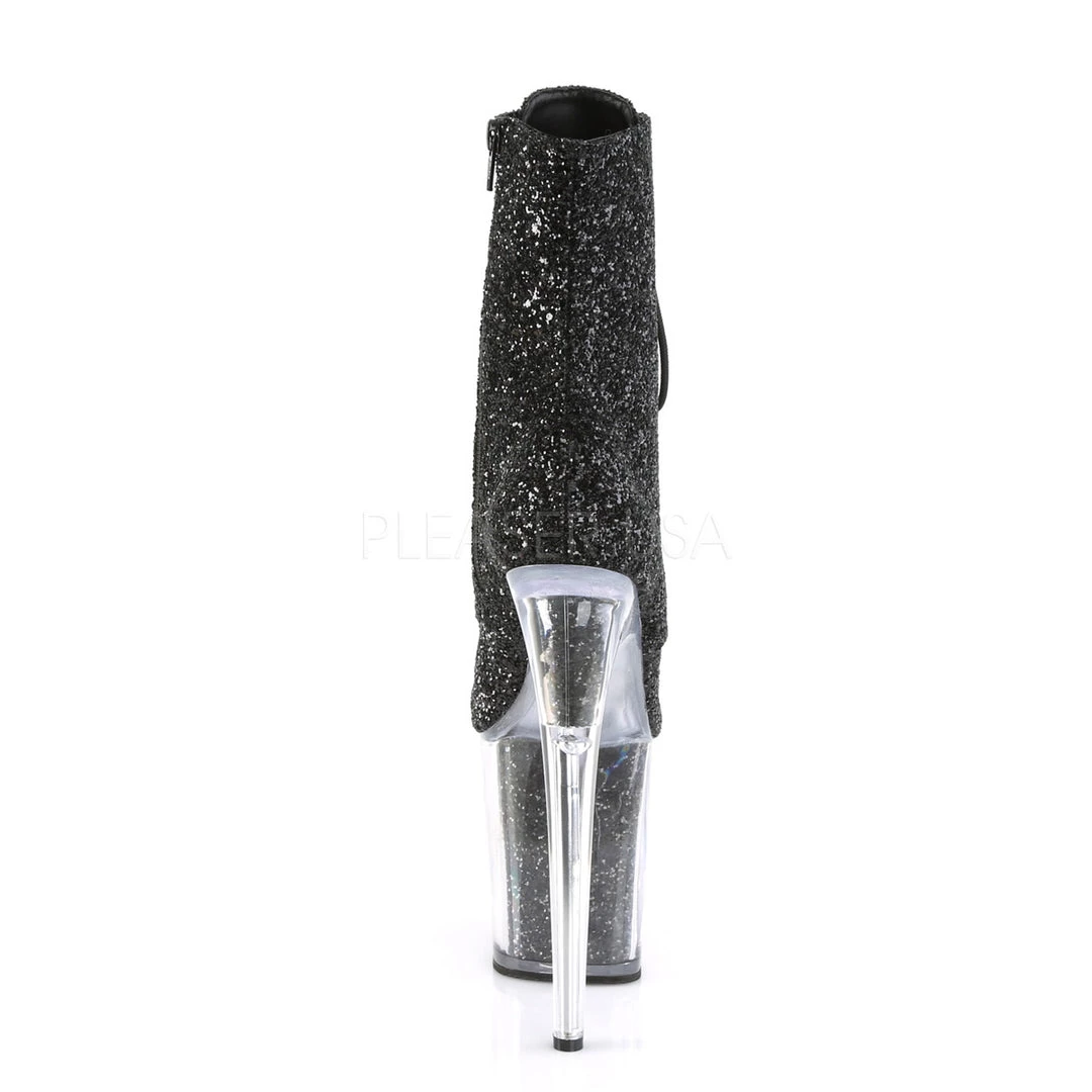 You’ll love the way you look in these 8 inch black glitter ankle booties with a 4 inch platform.